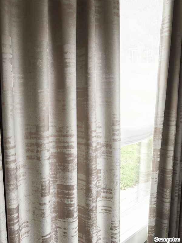 この生地で制作したカーテンには、縦に生地の継ぎ目が入ります。